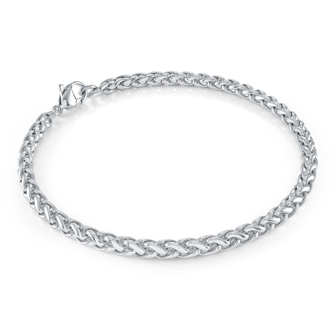 Crafted from durable stainless steel, this 4mm Wheat Link Bracelet offers a refined balance of strength and elegance. Its tightly woven links create a smooth, flexible design that sits comfortably on the wrist, making it ideal for daily wear or layering with other accessories. Resistant to tarnish and corrosion, this bracelet maintains its polished look over time, ensuring lasting quality and style.